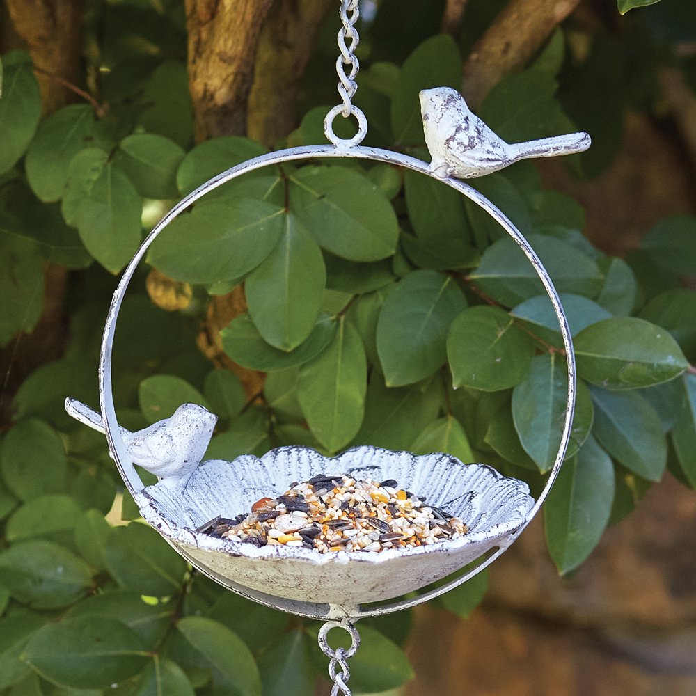 Welcome your hungry winged friends with lots of birdseed in this grandiose double bird feeder. Item is fashioned from cast iron with a whitewashed finish. Hook and chain included for easy hanging on patio, porch, or tree branch. Chain is 6½''H.
