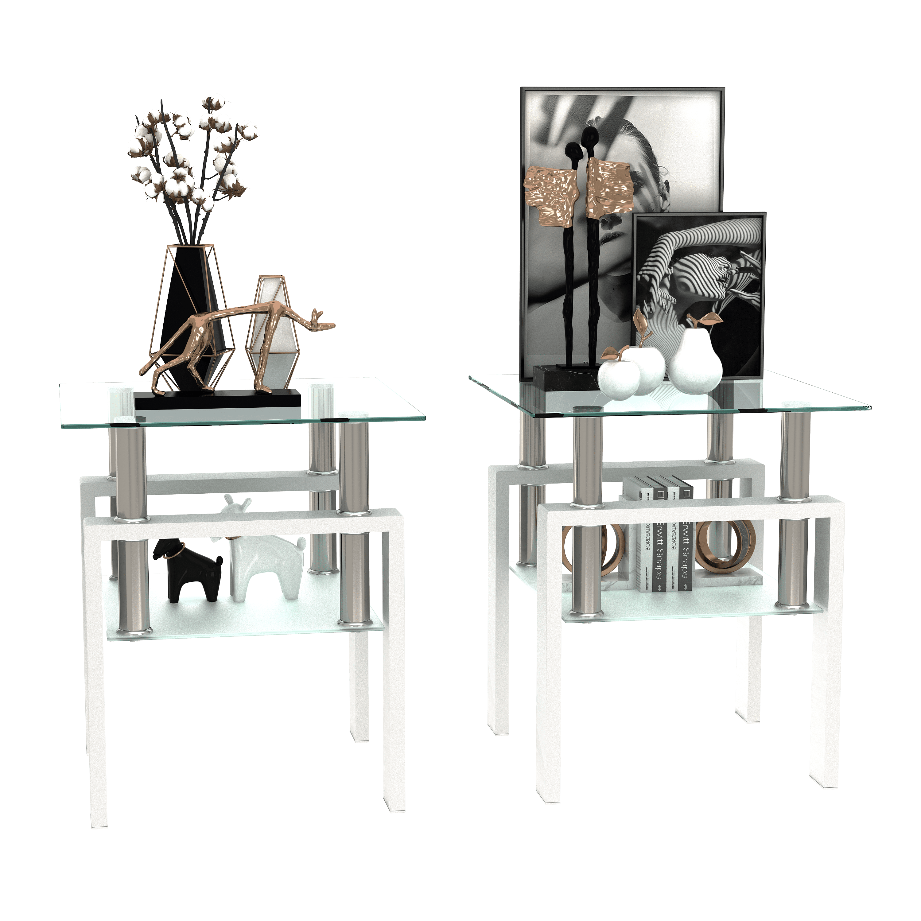 Set of 2, Modern Tempered Glass Tea Table Coffee Table End Table, Square Table for Living Room, Transparent/White